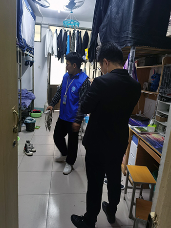 在检查时,发现宿舍无人时饮水机、充电器等电源开关有未关闭的现象并进行了及时处理,发放了提醒学生注意安全的用电温馨提示书。对于宿舍公共区域,特别是配电间、安全通道等高危场所以及消防橱窗等消防设施设备,也进行了全面的安全排查,希望从源头上消除学生宿舍的一切消防安全隐患。