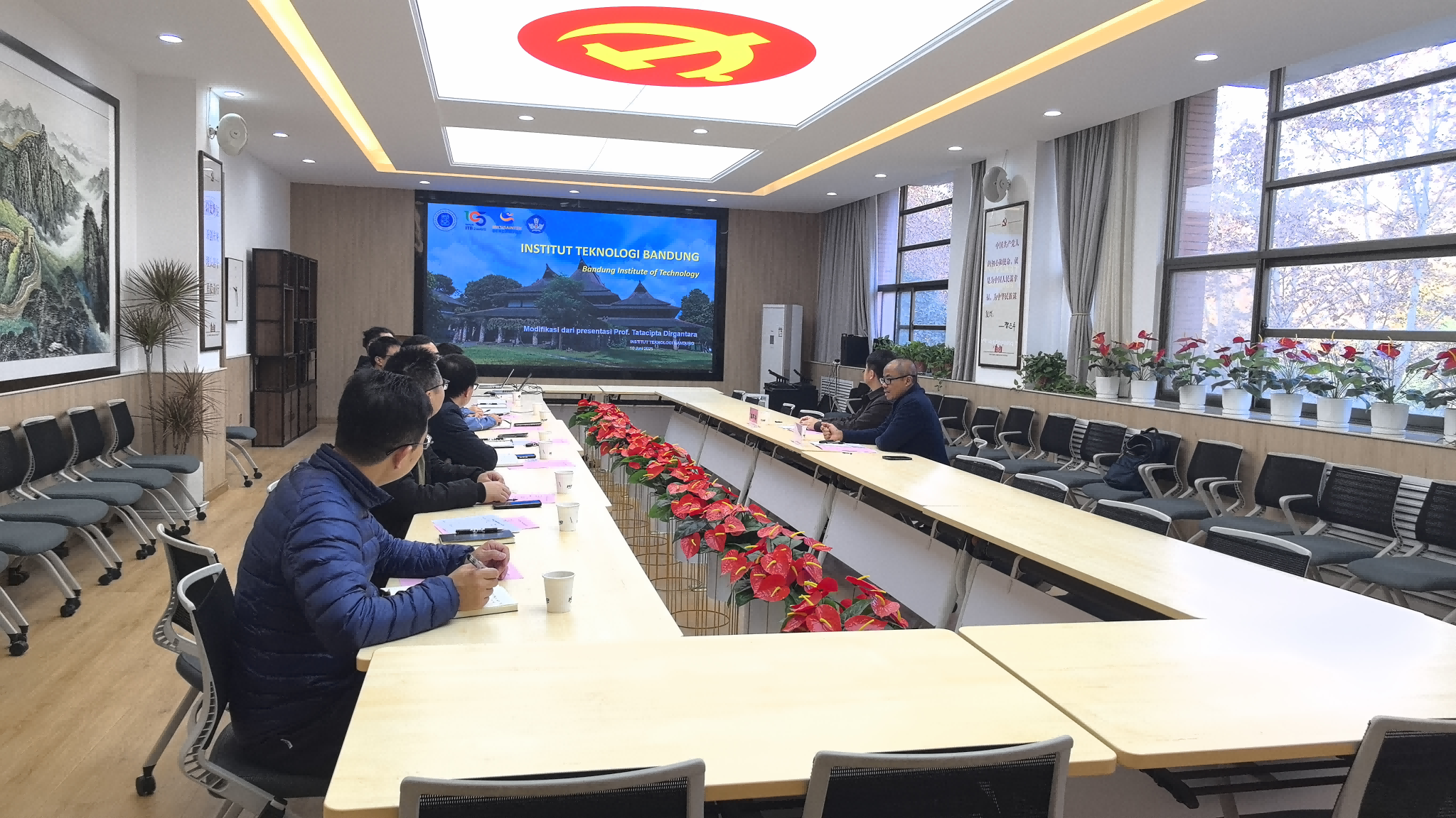 会上,袁占良代表学院对Prof. Dudy的到访表示热烈欢迎,并简要介绍了学院的学科特色。Dudy教授随后系统介绍了万隆理工学院地球科学与技术学院的学科布局、专业特色与师资结构,表达了与我院开展多层次合作的意愿。王震华结合学校国际交流合作政策,就未来双方在科研协作、师生互访、平台共建等方面的合作路径进行了展望。在交流研讨环节,双方围绕教师研修、学生联合培养、科研项目合作等具体内容进行了充分沟通。