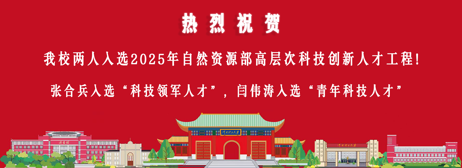 近日,自然资源部发文公布2025年度高层次科技创新人才工程入选名单,张合兵入选“科技领军人才”,闫伟涛入选“青年科技人才”,实现了河南省高校在该人才工程的突破。